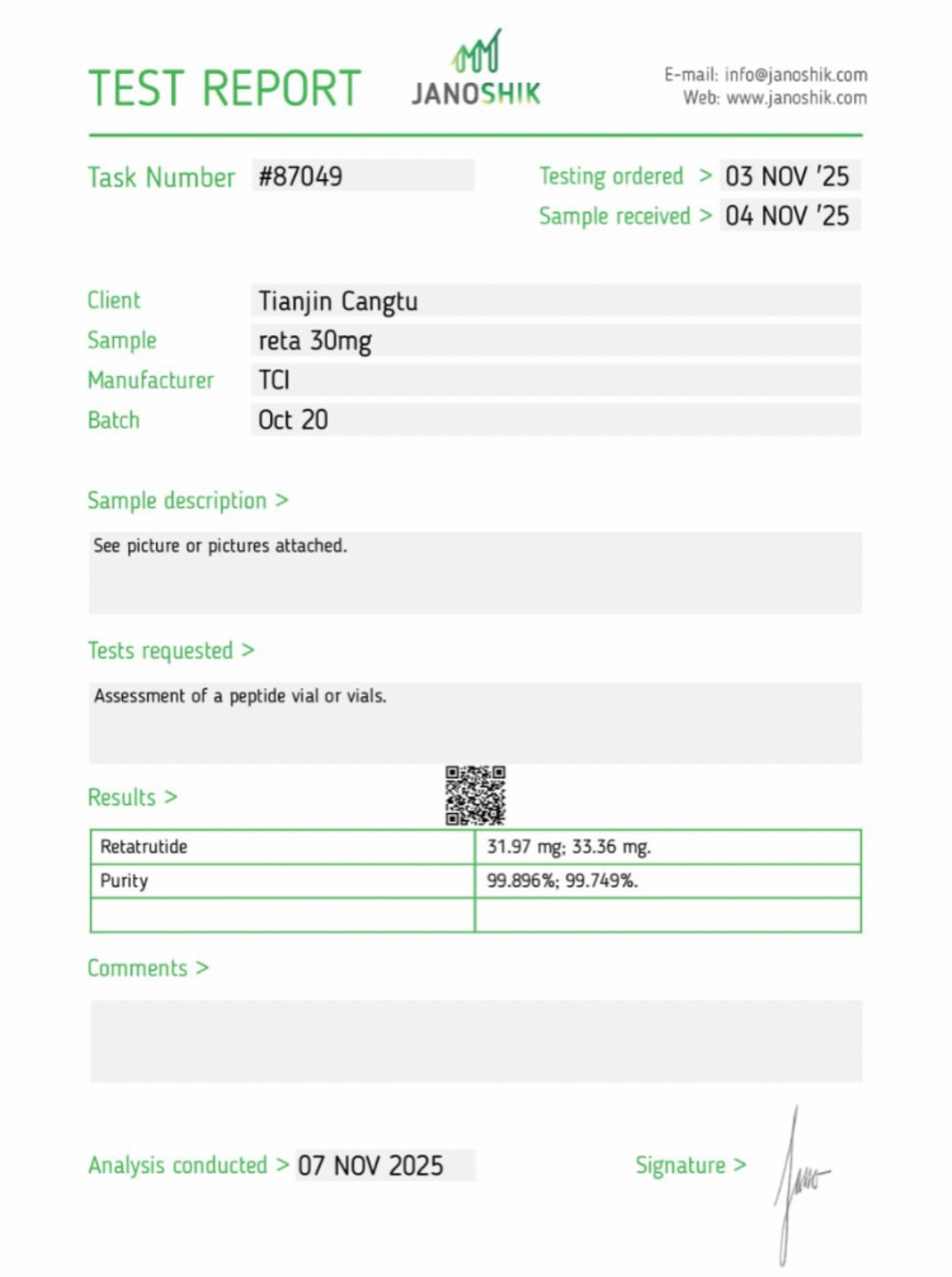 No raw analytical data, no real sense of the testing methods, not even a number or QR code to verify the test online. With little tethering this COA to a specific batch of retatrutide, it becomes eminently recyclable. One can imagine the shady group buy organizer terrorizing his customers with such a document, using a little Dunning-Kruger effect arrogance: