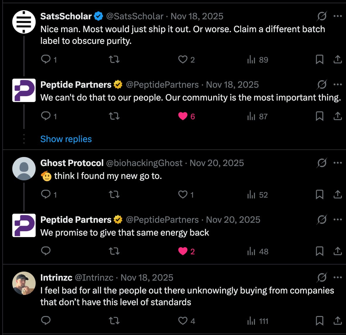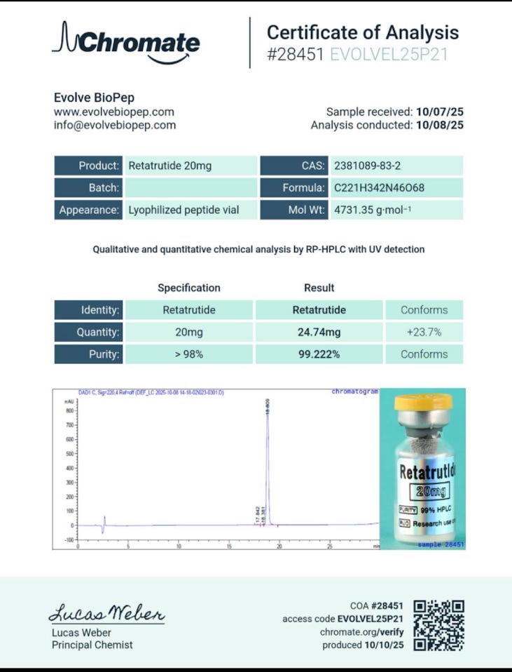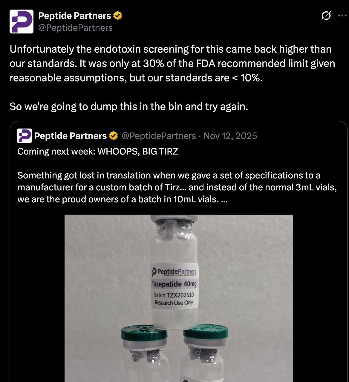Let’s return to SatsScholar’s comment on the Peptide Partners post about the bad batch of tirzepatide: “Nice man. Most would just ship it out. Or worse. Claim a different batch number to obscure purity.”