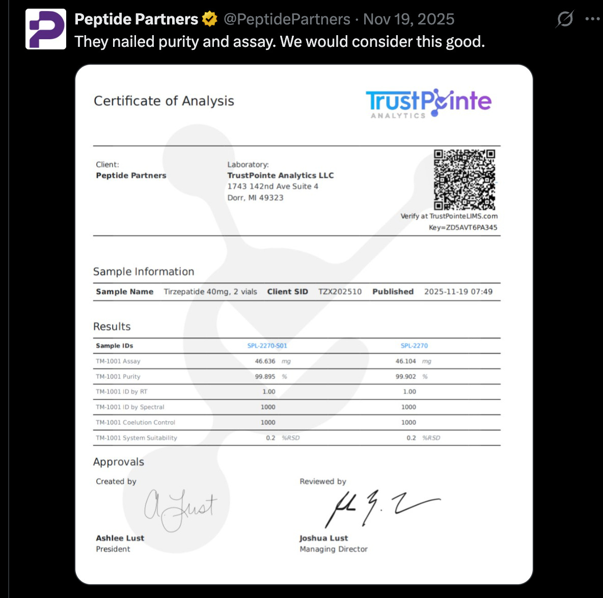 Next, the company tweets a Certificate of Analysis from TrustPointe Analytics, a chemical quality control lab specializing in peptides and other wellness products: “They nailed purity and assay. We would consider this good.”
