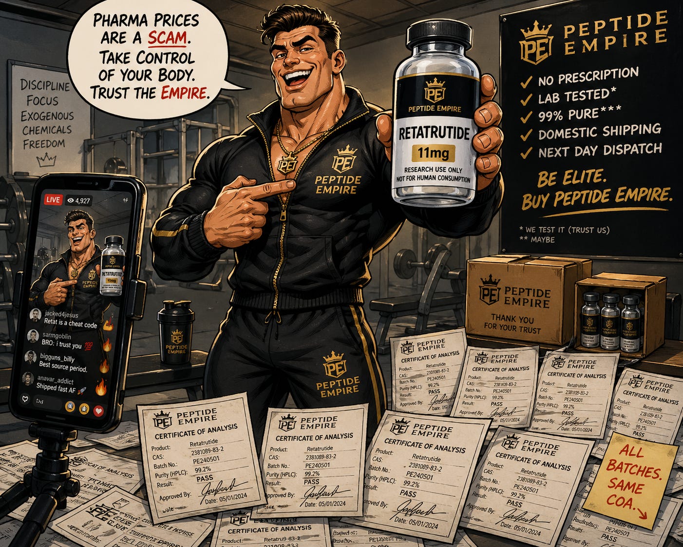 The influencer tells his 2 million followers to buy large amounts of untested retatrutide from a vendor that recycles shoddy COAs but is happy to pay influencers handsome commissions.