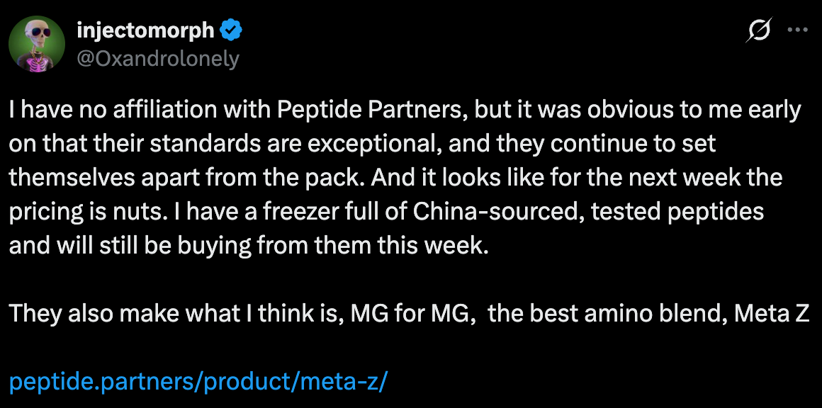 It doesn’t matter if the gymfluencer has millions of followers, if he’s best friends with Andrew Huberman or can bench 280. If he’s promoting bunk peptides through a bad vendor, he’s forestalling scientific progress. And you’re doing the same if you buy them from him.