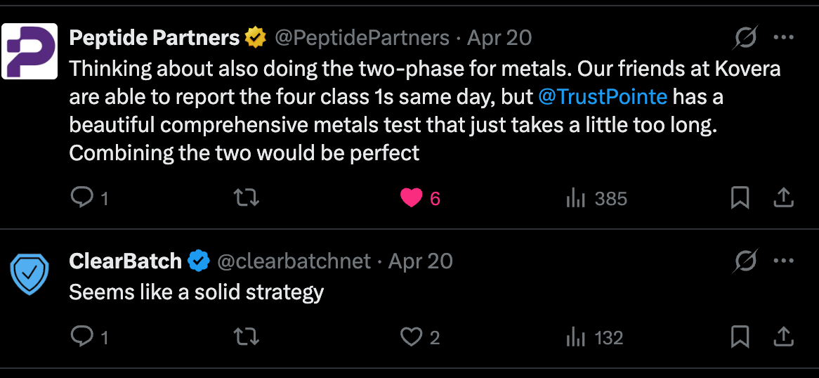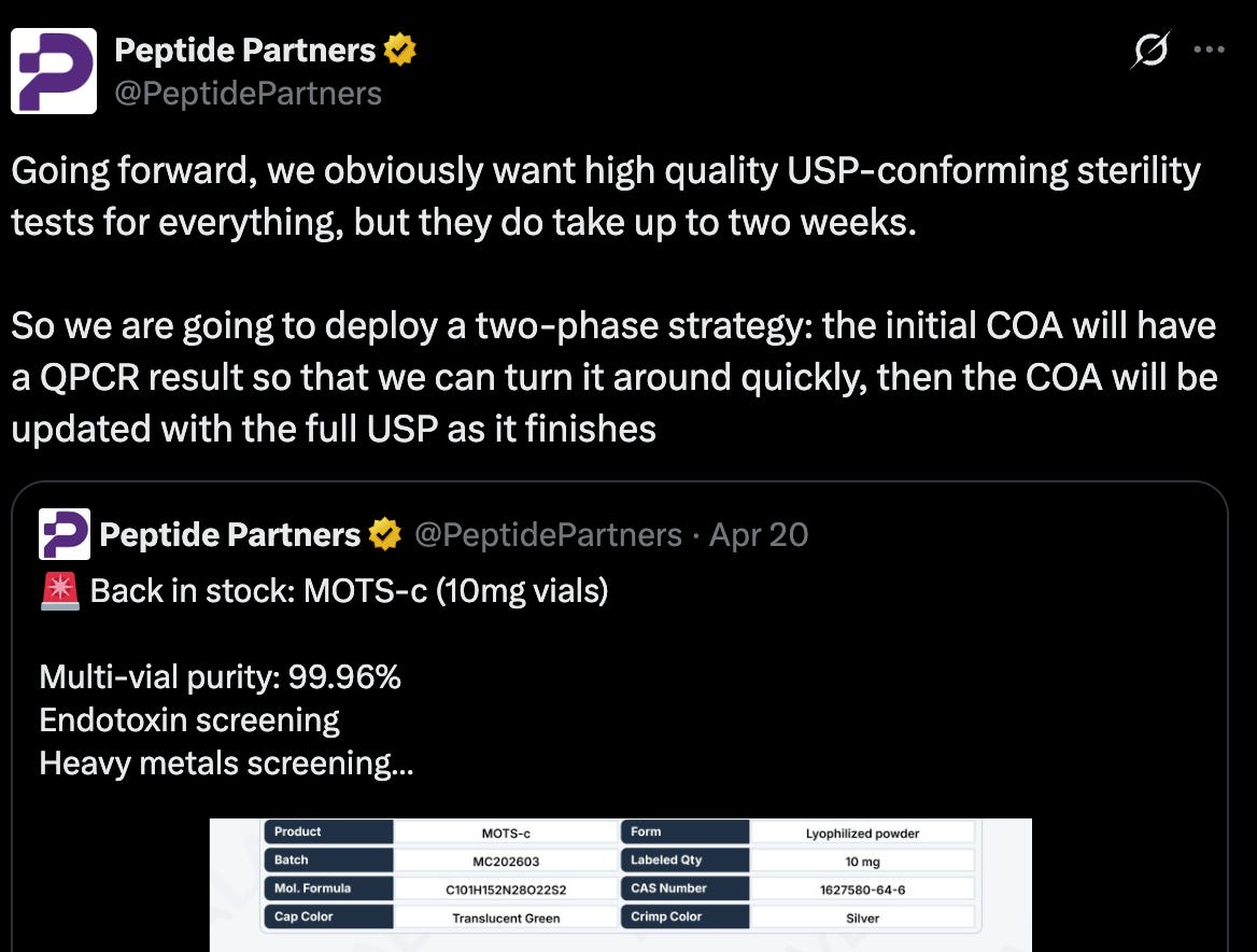 Continuing to use X like an ad hoc STEM research library, I may decide to learn a bit more about the vendors TrustPointe is working with. Take a look at the below from our very own Peptide Partners: