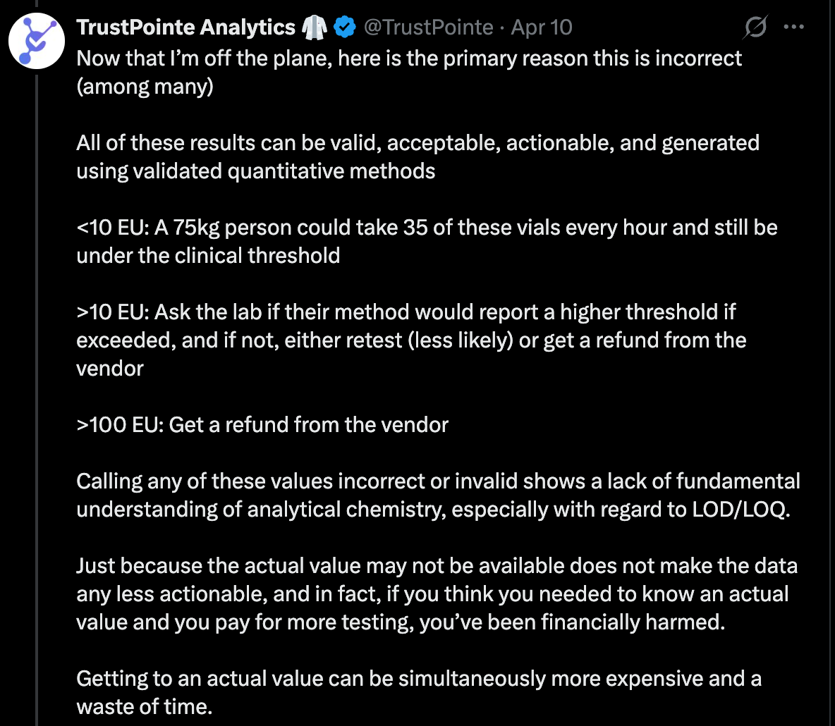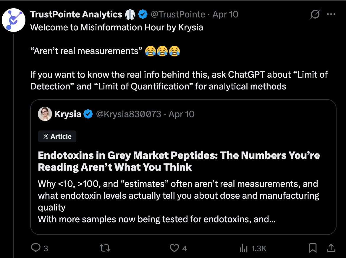 Had I simply taken the prior tweet at face value without bothering to read the chemist’s quote-retweet, I would never have learned about Limit of Quantification and Limit of Detection, valuable principles in understanding how analytic chemists screen for endotoxins, and how those screenings translate to the quantitative results I encounter on my peptides’ COA.